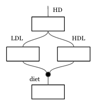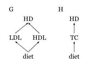 我们再来回顾一下那个引发因果一致性问题的经典案例[7,8]。早期研究认为饮食通过总胆固醇(TC)影响心脏病(HD),但不同研究显示TC对HD的作用方向矛盾。后证实TC包含低密度脂蛋白(LDL,促进HD)和高密度脂蛋白(HDL,抑制HD),需区分两者才能明确因果效应。这反映了生物医学中的常见现象:看似单一的物质实为多成分混合体,各成分作用可能相反。这便是一种因果不一致的粗粒化情形。