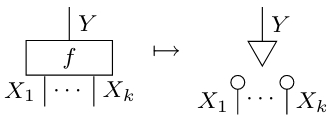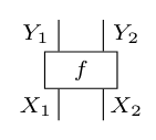 其中,字母表示变量,箭头表示因果关系。而在范畴论当中,我们用弦图(string diagram)来表示因果模型。此时,机制用一个小矩形表示。比如,输入X1,X2输出Y1,Y2的机制如下图所表示: