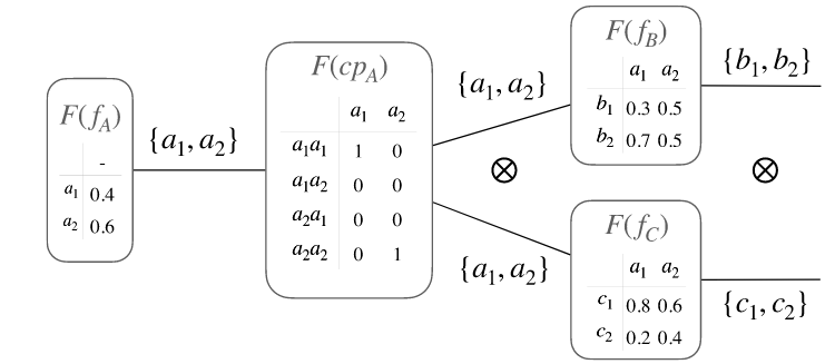 现在我从左到右来解释每个模块的含义:F(fA)表示A的边缘概率分布,这里有两个事件a1,a2,它们的概率分布满足归一化。然后,因为这是一个叉结构,所以有复制子操作,F(cpA)。如果它是经典系统而非量子系统,那么复制子所对应的TPM每一列就一定是完全确定的分布。经过这个机制,便有了两份a1,a2,它们分别经过F(fB),F(fC)。这两个TPM便产出了变量B和C。这两个过程是并行发生的,可以拼接起来。