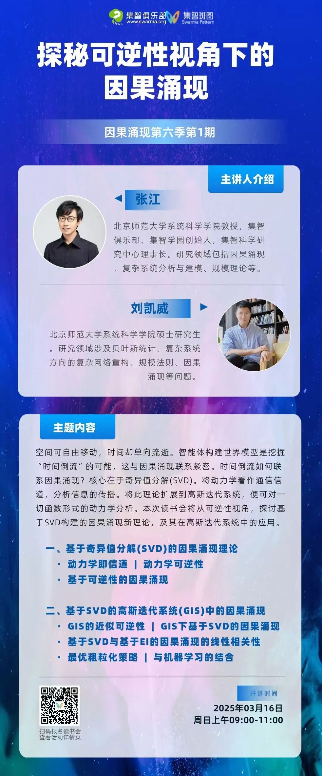 为了系统梳理因果涌现最新进展,北京师范大学系统科学学院教授、集智俱乐部创始人张江老师领衔发起「因果涌现第六季」读书会,组织对本话题感兴趣的朋友,深入研读相关文献,激发科研灵感。