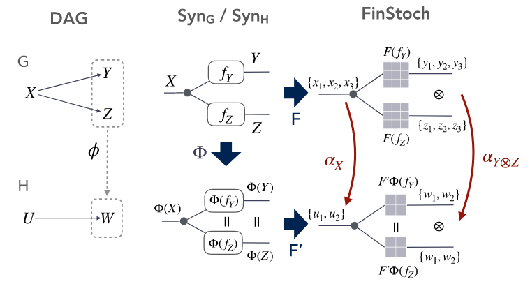 进一步地,如果我们还要保证概率上的因果一致性,就要在下图中定义一种可交换性。图中有两个作用在因果模型上的函子FG:SynG→FinStoch;FH:SynH→FinStoch,以及满足图同态的函子Φ:SynG→SynH。如果这里存在一组同态α:FG→ FHΦ,满足无论从哪条路径走,最后得到的Y的边缘概率分布是一样的,我们就称这样的一组同态为自然转换(natural transformation)。换句话说,此时这些路径彼此是可交换的。