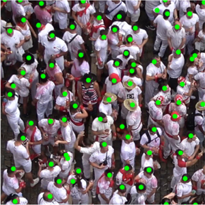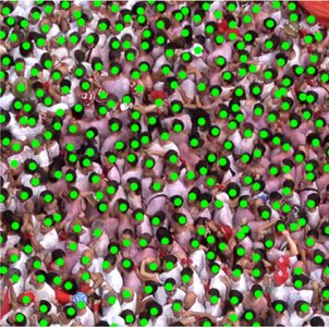 图X 左:开幕前 57 分 15 秒的人群特写。绿色圆点显示了节日参与者头部的位置。右:开幕前 30 秒的人群特写。人群密度显著增加