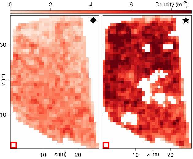 图X 开幕前 57 分 15 秒(左)和开幕前 30 秒(右)的两个局部密度图快照。白色区域对应视野被建筑物、旗帜和气球遮挡的区域
