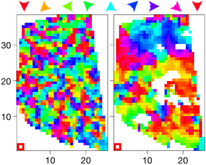 图X 开幕前 57 分 15 秒(左)和开幕前 30 秒(右)的两个人群中自发流动局部方向图。很明显当人群密度提高时,自发地形成了宏观尺度的同向运动