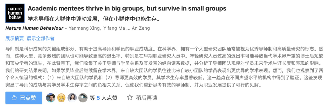 Nature专栏报道北京师范大学系统科学学院曾安老师团队最新发表于Nature Human Behaviour研究,研究发现,相较于小规模团队,大规模实验室培养的学生往往会取得更高的学术成就,同时也更有可能离开学术界。曾安老师多年来从事复杂网络,科学学和信息过滤方面的研究,取得了很多有影响力的成果,也曾在集智俱乐部发起复杂系统视角下的科学学读书会,就“复杂系统视角下的科学学”和“科学家职业生涯动力学”等主题进行过多次分享,欢迎感兴趣的朋友加入。