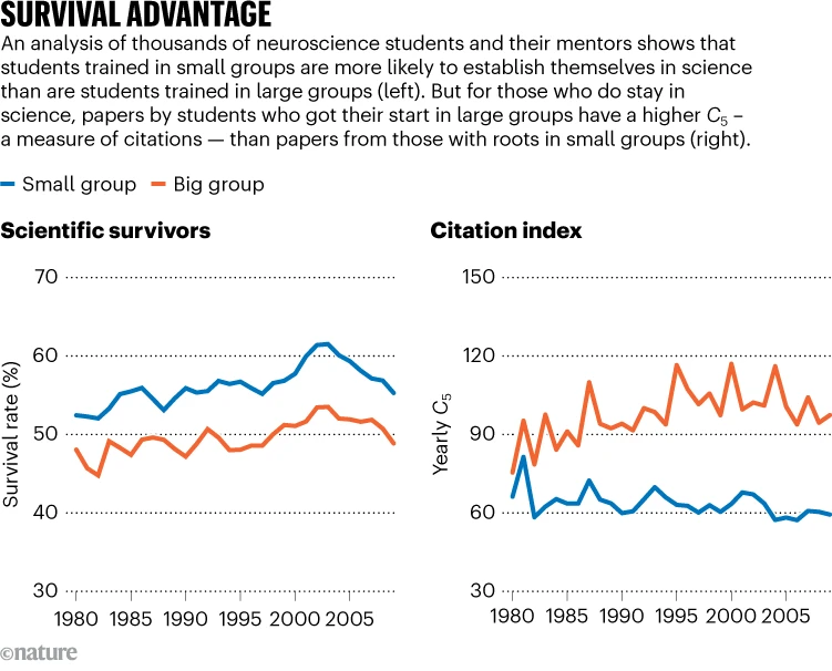 为了弄清楚大团队培养的研究人员能够成功的原因,研究分析了由学生担任第一作者、导师担任通讯作者的论文,这类论文通常意味着学生得到了导师的充分关注。研究发现,大型团队培养且最终留在学术界的研究人员,发表此类“学生一作”论文的数量明显高于那些退出学术界的人员。Sinatra表示:“现在我们有了量化的证据表明,导师的关注很重要,而不再仅仅是推测。”