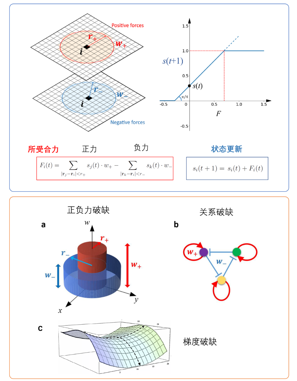 三条自组织规则只涉及基本物理量(见图1),可简述为:(1)个体对周围群体施加正、负力;(2)个体受力的叠加;(3)所受合力改变个体状态。