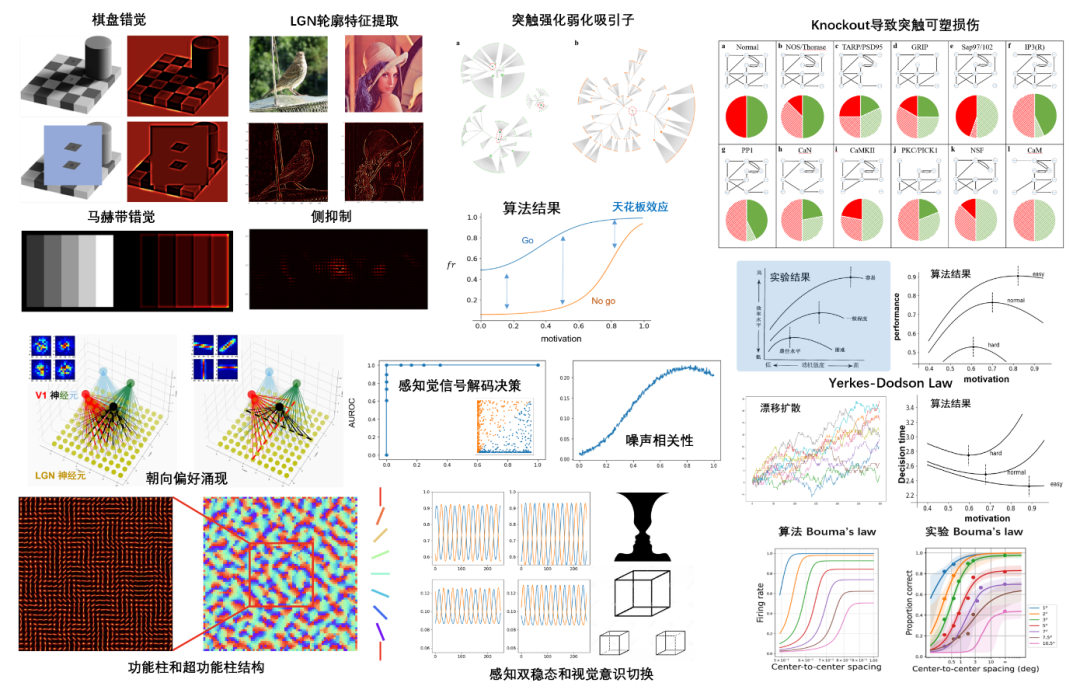 基于大脑原理开发的智能算法,具有与人脑发育过程高度的相似性,包括逐层前向训练方式、超小样本、自然场景刺激、无监督学习、参数自适应调节等,与深度学习大模型有本质区别。大脑智能算法得到了16种认知神经科学、神经生理学、脑发育、脑疾病和行为心理学中重要实验的检验(见图4),包括突触强化和弱化的分子调控动力学吸引子、敲除调控分子造成的突触动力学损伤和脑疾病严重程度的强相关、视觉棋盘错觉、视觉马赫带错觉、外侧膝状体(LGN)的轮廓特征提取能力、初级视觉皮层的侧抑制、初级视觉皮层神经元的朝向偏好涌现、初级视皮层的超功能柱和风车结构、视觉拥挤现象的Bouma’s定律、行为心理学的耶克斯-道德森倒U定律、决策时间和动机的U型关系、决策的漂移扩散现象、决策行为和时间的对应关系、感知双稳态和视觉意识切换的神经振荡和全脑同步等。
