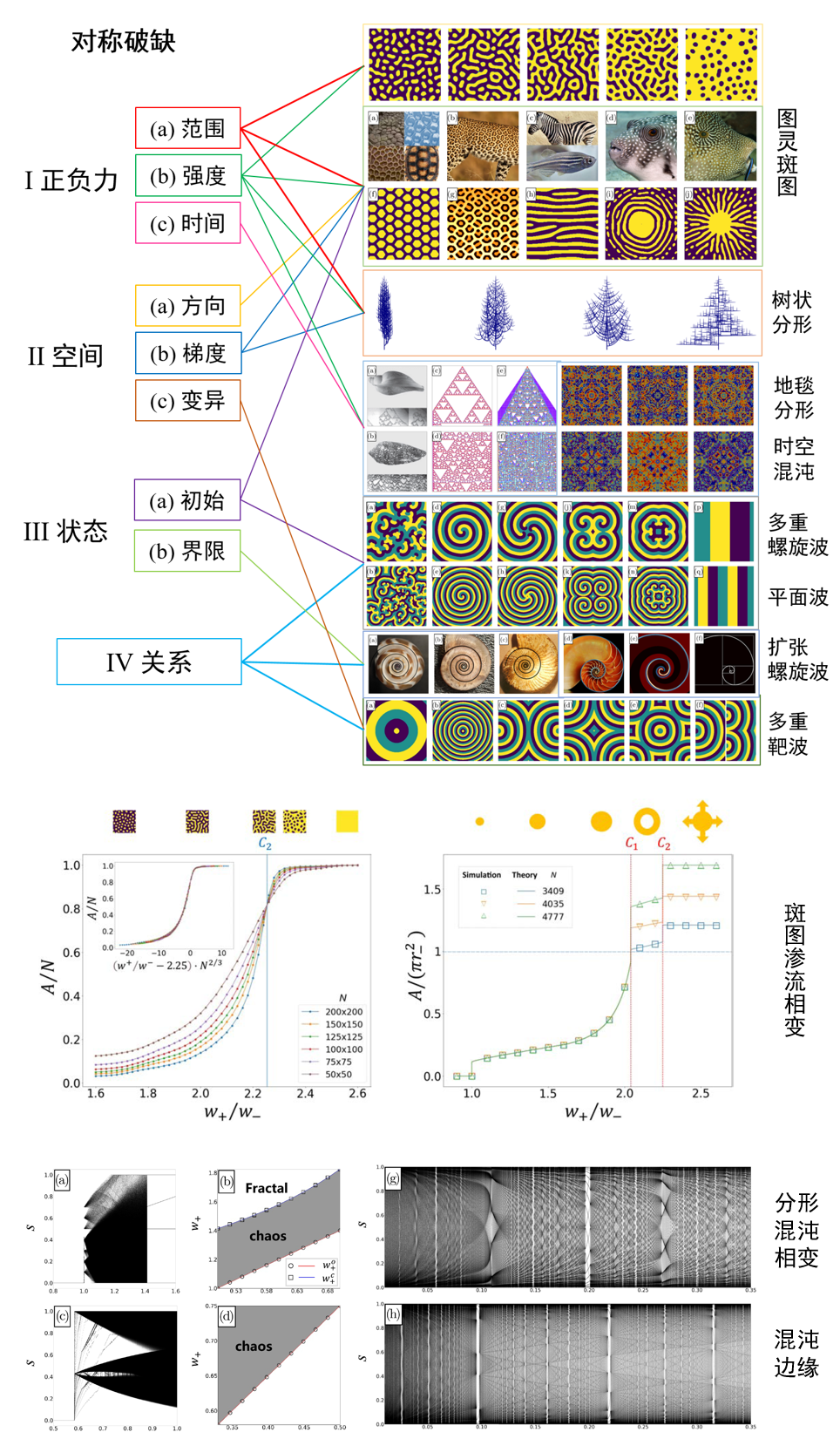 三条自组织规则的对称破缺组合能够产生自然界中的各种复杂现象和时空模式(见图2),包括各种图灵斑图(动物外表图案和玄武岩等)、分支分形(树、肺、河道、闪电)、地毯分形(海螺花纹、杨辉三角)、螺旋波(阿米巴虫释放物质、化学振荡、海螺壳、飓风、星系)、靶波(心跳、生长因子)、平面波、时空混沌(混沌地毯和倍周期分叉)、斑图渗流(非连续相变)、分形到混沌的相变(分形地毯到混沌地毯)、混沌和秩序共存(波的边缘混沌)、自组织临界性(地震、山火)等。在生成各种复杂现象的同时,课题组给出了斑图渗流相变的解析解、有限尺度标度分析、分形到混沌的相变解析解、螺旋波、靶波和平面波的各种特征的解析解等(见表1)。