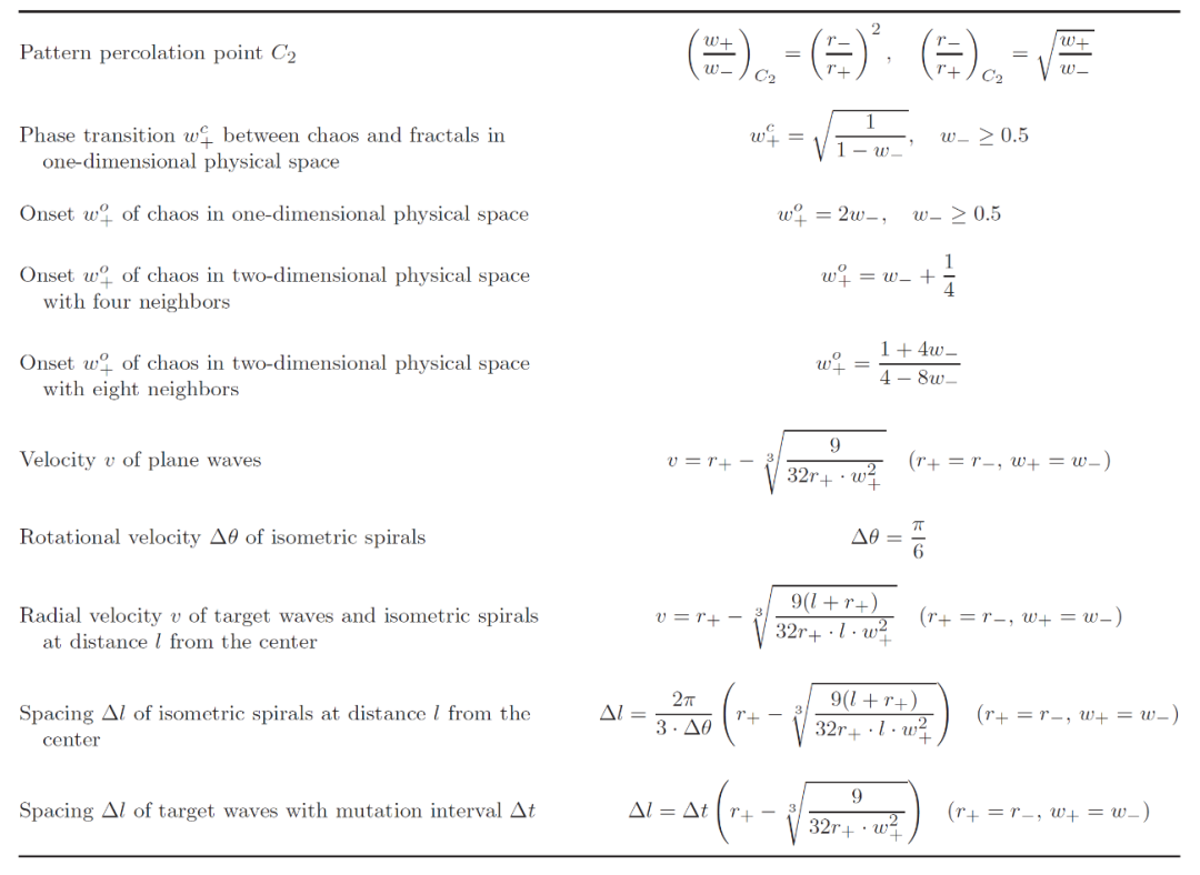 表1:复杂斑图、模式和现象的理论解析解,包括斑图渗流相变点、混沌的涌现、分形—混沌相变、波长、波速、转速等