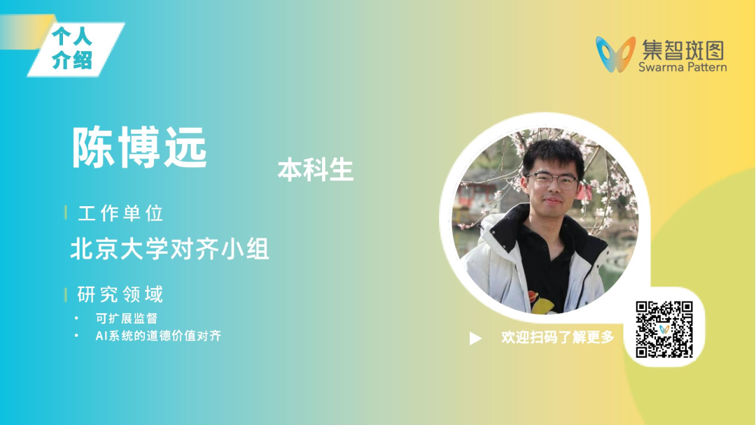 陈博远,北大对齐小组(PKU-Alignment Team)成员,师从北京大学杨耀东老师。他关注的问题包括如何利用弱模型实现对强模型的可扩展监督(这对解决超对齐问题至关重要),以及如何以理论和实验相结合的方法帮助实现AI系统的道德价值对齐和解决相应的社会技术问题。