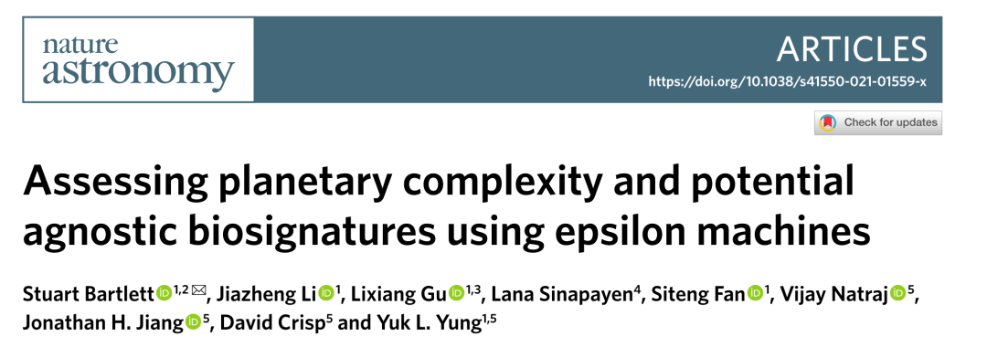 2022年,nature旗下的一个期刊上发表了一篇名为《Assessing planetary complexity and potential agnostic biosignatures using epsilon machines》的文章。题目中的epsilon machines,就是计算力学里用来刻画主体内在模型的概念。文章中,作者们用计算力学所贡献的复杂度指标——统计复杂度来分别度量地球和火星的辐射波长数据,发现地球的平均复杂度比火星高了大概50%。所以在太空探索中,我们可以用这样的理论工具来检验每一颗新发现的行星,判断它是否与地球相似,是适合生命发展的栖息地。