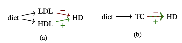 一直以来,人体血液中胆固醇的含量被认为是影响心脏病发作的重要变量,但在临床实验上一直有着两个互相矛盾的现象:有人发现胆固醇水平提高会促进心脏病发作,另一些人则发现是抑制作用。现在人们搞清楚了,实际上是因为有LDL和HDL两种胆固醇,它们分别对心脏病发作是抑制和促进作用。如果你的饮食让LDL水平提高,就降低了心脏病风险,而如果提升的是HDL,心脏病风险反而会上升,尽管从胆固醇测量的角度来看,两种饮食习惯对应的胆固醇含量是相同的。这说明,直接用胆固醇去描述这里面的因果关系,虽然更简洁,但不合理,是典型的因果不一致的情形。