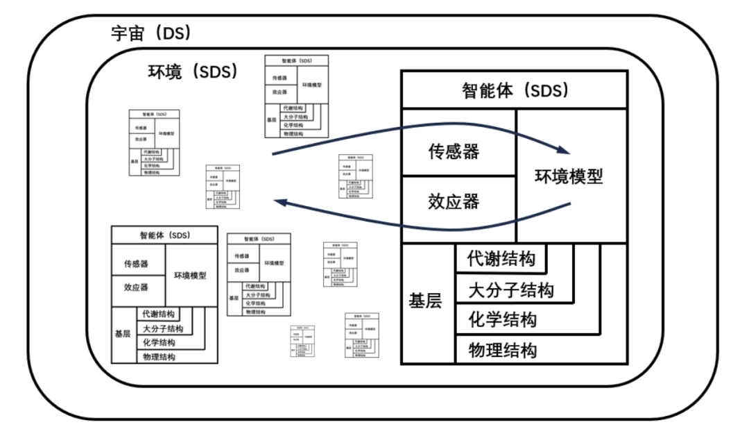 在众多研究涌现的框架里,计算力学的框架相比较而言很宏大,而且讲起来有特别的吸引力。它依托于生物进化论的思想,以信息论为工具,同时有硬核的统计物理解释以及严谨的数学表达。如下图所示,它假设宇宙是一个巨大的确定动力系统,每一个生物体或者说主体,都因其有限的观察能力,只能感知到宇宙的一部分,也就是环境。环境中就有噪音,而这很可能威胁到主体的生存。所以迫于进化的压力,每一个主体都要尽可能有能力预测到环境的变化。对于每一个主体的构造而言,除去那些实际的物理和化学结构以外,计算力学关注的是它的“虚拟层”。主体根据传感器获知环境的历史信息,再根据自己的内在模型做出预测,然后做出相应的行动。这个内在模型的概念,和现在流行的自由能原理与世界模型理论也是相一致的。