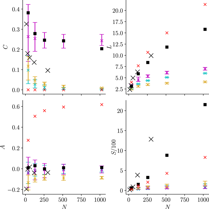 ENTSO-E网络模型(黑色方块)、IEEE测试(黑色交叉)、小世界(紫色)、无标度(黄色)、随机(绿松石色)和规则网络(2d晶格)的拓扑和频谱特征