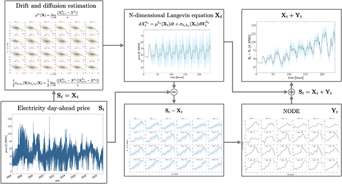 文章提出了一种结合N维朗之万方程与神经常微分方程的数据驱动模型,用以系统捕捉和预测电力价格时间序列中的平稳与非平稳特性,并在西班牙电力日内市场中验证了其有效性。