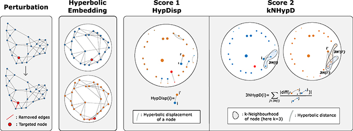 本文介绍了两种检测网络局部扰动的新分数,考虑对网络进行非欧几里得表征,将它们嵌入到双曲几何的Poincaré disk model中。该方法对真实大脑网络进行了潜在几何表征,识别并量化癫痫手术对大脑区域的影响。