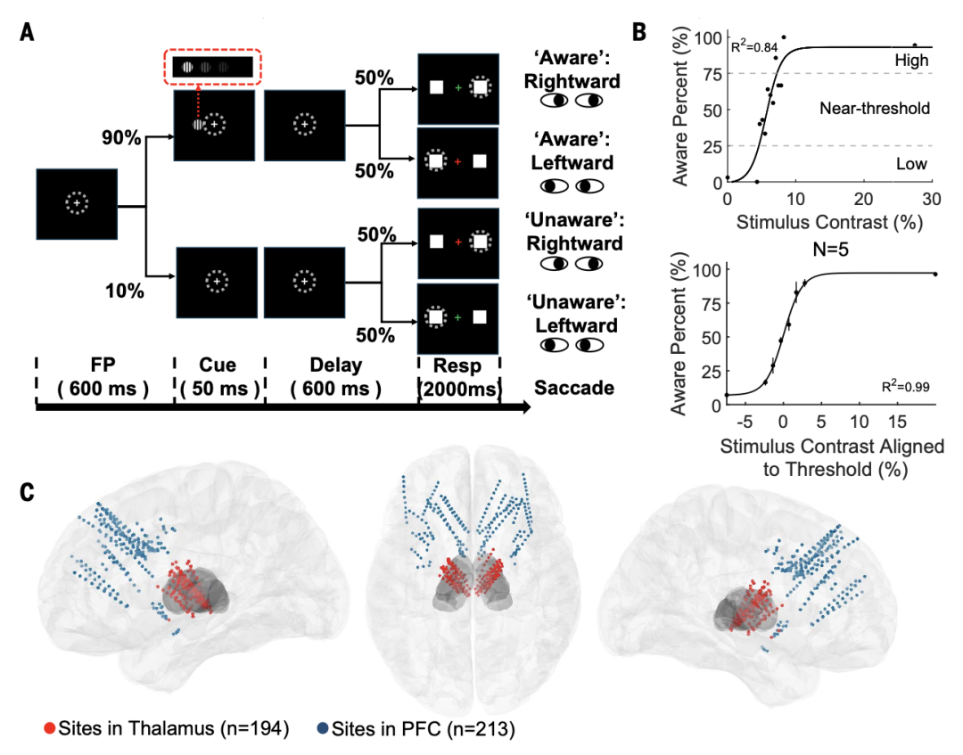 图 1. 视觉意识任务、心理测量曲线和电极定位。(A)视觉感知任务示意图。(B)心理测量检测曲线( Psychometric detection curves)。(上)一个参与者的感知觉百分比示例。(下)所有参与者的数据。图中的每个黑点表示在相关对比水平上的意识百分比,黑色曲线表示拟合的心理测量函数。意识百分比>25%和<75%被定义为接近阈值(near-threshold)。底部示意图中,整体的图片对比度与个体参与者的感知阈值(50%的意识百分比)一致。N,参与者数量;R2,决定系数。(C)在蒙特利尔神经学研究所(MNI)大脑模板上投影的所有记录电极点的左、右、俯视图。红色点表示丘脑的记录部位,蓝色点表示PFC的记录部位。