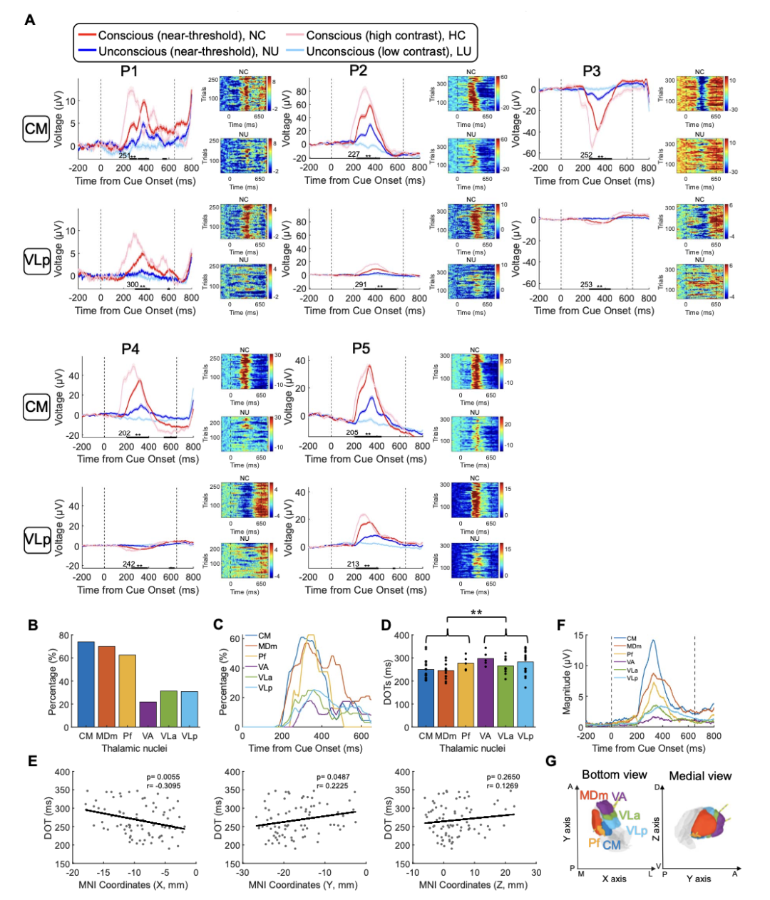 图 2. 丘脑核团中意识相关活动的特征。(A)每个参与者(P1至P5)在单个记录点的sEEG活动示例。在每个参与者的图中,左图显示了四种不同条件下sEEG活动的总体平均值。曲线的阴影区域表示扫描电镜。两条黑色虚线分别在0和650 ms时表示光栅开始和注视点的颜色变化。粗黑线表示NC和NU条件之间的显著差异(P < 0.01校正,独立样本t检验)。每个面板的右侧显示了在NC(上)和NU(下)条件下的单次试验中的sEEG振幅。每个图中的颜色条表示sEEG振幅。(B ~ D)丘脑核体现意识相关记录位点的百分比(B)、动态百分比(C)和发散开始时间DOTs (D)。在D中,每条内的黑点表示核团内记录位点的DOTs。** p < 0.01。(E)解剖位置与DOTs的相关性。R,相关系数。(F)丘脑核中意识相关活动的振幅。颜色与B所示相同。0和650 ms时两条黑色虚线分别表示光栅起始和定点的颜色变化。(G)丘脑核团的三维重建图。