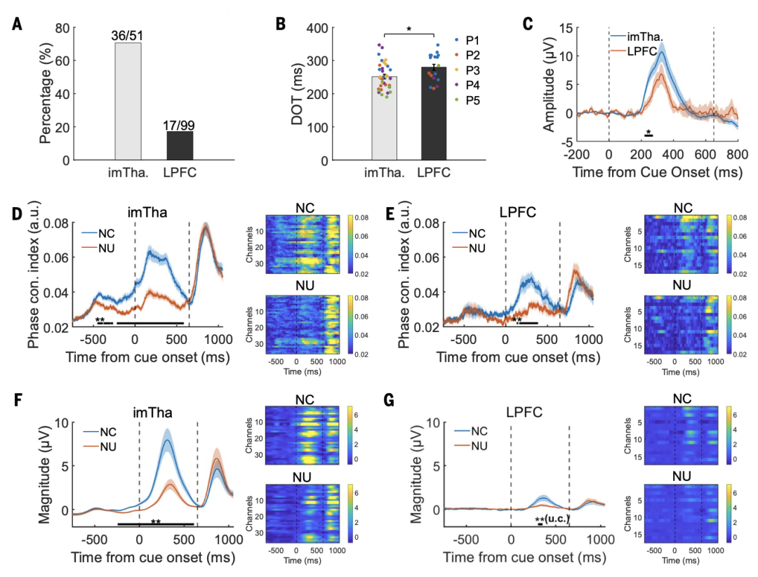 图 4. imTha和LPFC中意识相关活动的特征。(A) imTha和LPFC中意识相关记录位点的百分比。(B) imTha和LPFC的延迟(DOTs)。灰条和黑条分别表示imTha和LPFC的平均DOTs。每个条形内的彩色点代表每个区域内记录点的点。每种颜色代表每个参与者的数据。** p < 0.01。(C) imTha和LPFC中意识相关活动的振幅。蓝色和橙色的线分别代表imTha和PFC。两条黑色虚线分别在0和650 ms时表示光栅开始和注视点的颜色变化。黑色实线表示imTha和PFC的振幅显著不同的周期。(D、E) imTha和LPFC中与意识相关的ERP位点的θ波段相位集中指数(phase concentration index)。两条黑色虚线分别在0和650 ms时表示光栅开始和注视点的颜色变化。黑色实线表示有意识和无意识状态下相位集中指标显著不同的周期。右边的热图显示了所有意识相关部位的相位集中指数。(F和G) imTha和LPFC的意识相关ERP位点的θ波段大小。与(D)所示相同,但θ波段大小不同。