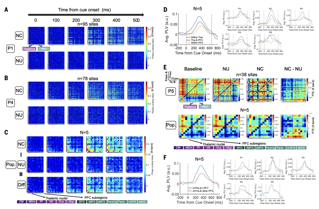 图 3. 意识相关的丘脑核团-前额叶相位锁定。(A和B)两个参与者(P1和P4)在传感器水平(n*n)的PLV变化。从左到右,在有意识(上图)和无意识(下图)试验中光栅出现后0,100,200,300,400和500ms的时间点,每个记录点之间的PLV。颜色表示PLV (θ波段)。黑线表示丘脑区域和PFC区域的边界。N为记录位点数。(C)根据丘脑核和PFC亚区分组的PLV结果,显示了所有参与者的总体结果。下图显示了有意识和无意识试验之间PLV的差异。(D)丘脑和PFC之间的平均PLV。(左图)所有参与者的总体结果。(右面板)参与者1至5 (P1至P5)的个人结果。(E) θ波段的个体(上图)和群体(下图)PTE结果。(F)丘脑板间核和内侧核(imTha)与PFC亚区之间的平均PLV。(左图)所有参与者的总体结果。(右图)个人结果。对于参与者5,由于采样有限,其他PFC分区的结果缺失。