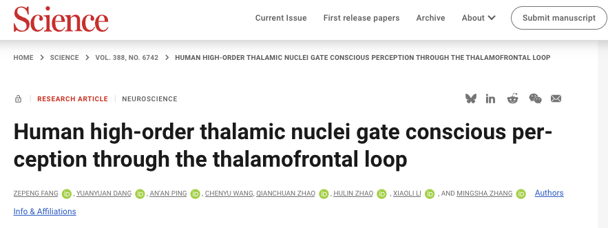 论文题目:Human high-order thalamic nuclei gate conscious perception through the thalamofrontal loop
