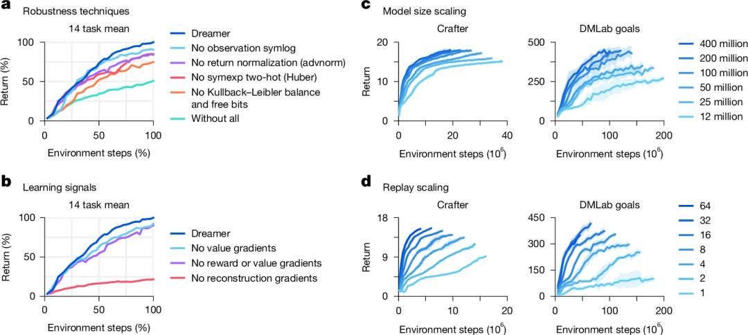 图 5. 消融和稳健的 Dreamer 规模缩放。