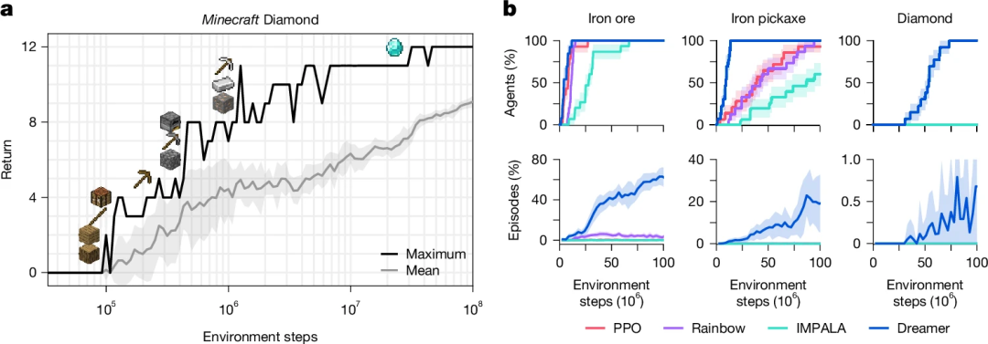 《我的世界》的钻石收集任务需要智能体通过复杂的行为链(如资源采集、工具制作)达成目标,人类玩家通常需20分钟完成。此前,AI算法需依赖人类数据(如视频预训练VPT)或课程学习,而Dreamer首次在无任何先验知识的情况下,仅通过1亿环境步数(约10小时)成功挖到钻石,这一成果展示了无监督学习的巨大潜力。