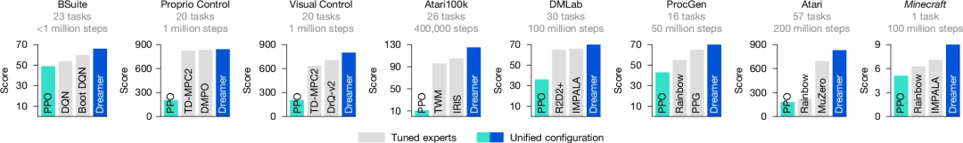 在包括连续控制(如机器人运动)、离散动作(如游戏操作)、视觉输入(如像素级决策)等8个领域的150多项任务中,Dreamer的表现与专用算法相当甚至更优。例如,在Atari游戏和机器人控制任务中,Dreamer无需调整即可达到顶尖水平,证明了其泛化能力。