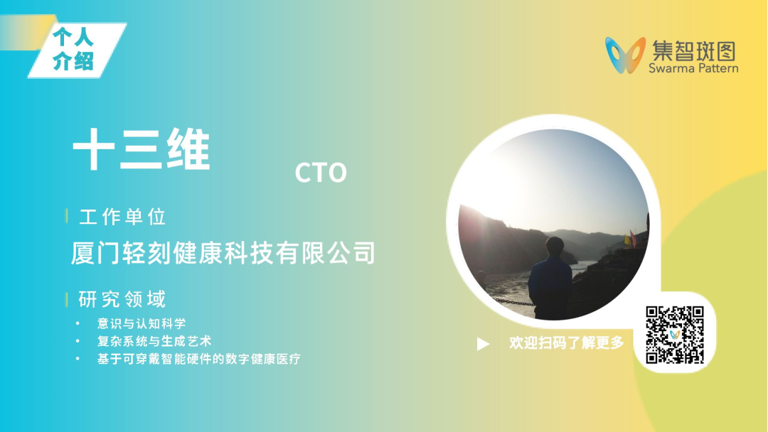 十三维,厦门轻刻健康科技有限公司CTO、数智健康研究院院长,AI和元宇宙研究者,科学作家。主要关注研究意识与认知科学、复杂系统与生成艺术、基于可穿戴的智能硬件的数字健康医疗、基于区块链的数字物质理论与人工生命、基于大语言模型的Agent产品落地等,在IEEE等学术期刊,集智俱乐部、返朴、追问、文艺报、长江文艺等多家科普媒体发表论文和文章。