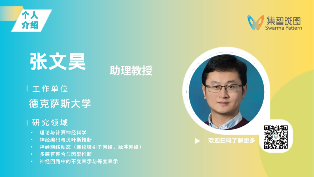 张文昊,德克萨斯大学西南医学中心计算神经科学实验室负责人,助理教授。 实验室结合规范性理论和生物学上合理的神经回路模型,研究神经信息处理的原理,旨在解答感知、认知和行为是如何从神经回路中涌现出来的。他的主要研究成就包括研究非线性神经回路动态,探讨神经回路动态如何实现认知贝叶斯计算,以及如何在神经回路中实现群不变/等变表示。
