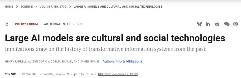 大模型正重塑我们的社会文化生态,但其本质常被误解。《Science》上的一篇最新文章,揭示大模型并非自主智能主体,而是一种革命性文化社会技术,类似于语言、印刷与市场制度。它以独特方式汇聚并重构人类信息,成为“人类社会人工系统”的新变体。这一重新定位的理论框架引导我们超越“机器接管”与“乌托邦助手”的狭隘辩论,转而关注更为现实且紧迫的问题:大模型将如何影响资源分配、文化多样性、科学进步以及权力结构的重构?