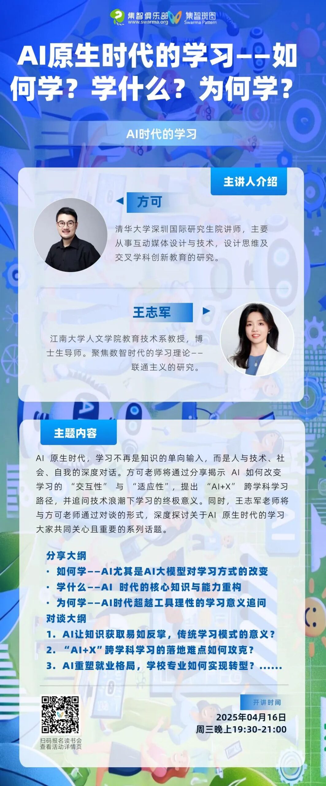 在 AI 原生时代,学习不再是知识的单向输入,而是人与技术、社会、自我的深度对话。方可老师将基于其在互动媒体设计、设计思维与交叉学科教育领域的前沿实践,揭示 AI 如何改变学习的 “交互性” 与 “适应性”,提出 “AI+X” 跨学科学习路径,并追问技术浪潮下学习的终极意义 —— 如何在效率至上的社会中,通过学习实现个体生命价值与社会意义的共生。