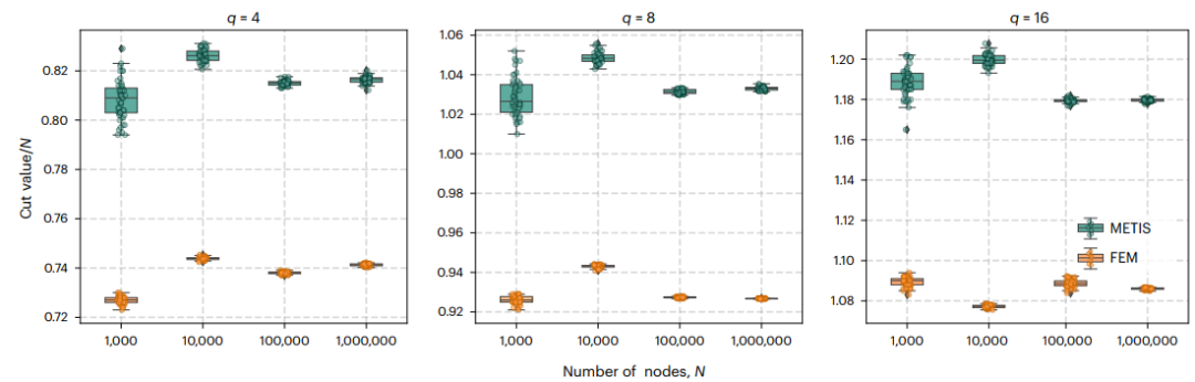 在百万节点随机图在bMinCut问题上的测试中,FEM的归一化割值比METIS低22-26%(图4):