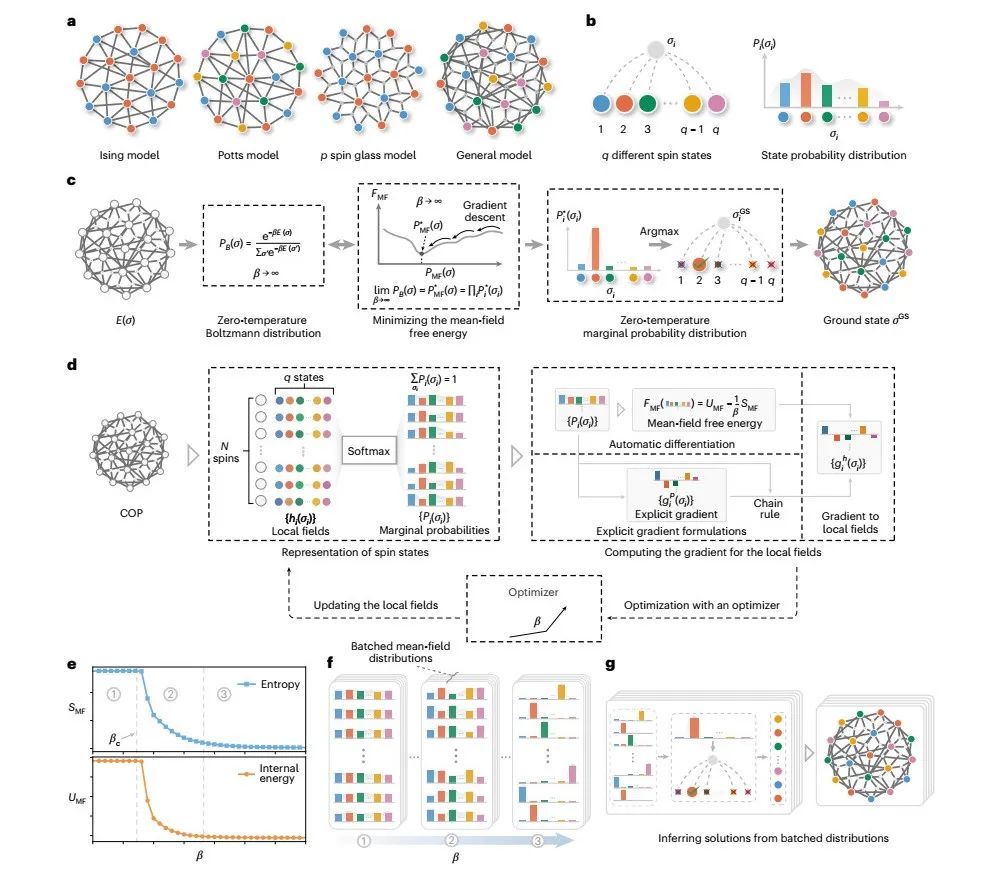 图1. FEM解决组合优化问题(COPs)的原理与框架。a图展示FEM可以解决的四种不同类型的COPs问题,即伊辛模型, 波茨模型,p-自旋玻璃模型和通用模型; b图展示,在通用COPs中,每个自旋变量σᵢ可处于q种不同状态(标记为1, 2, …, q),其状态概率由边缘概率Pᵢ(σᵢ)表示。彩色条形图直观展示各状态概率分布; c图:通过变分自由能最小化逼近基态解的过程;d图为FEM的核心计算框架,包括了局部场参数化、概率转换、梯度计算和并行优化四个步骤;e图展示了在退火过程中能量与熵的演化情况;f图展示了边缘概率{Pᵢ(σᵢ)}在退火过程中呈现出的三阶段的演化特征:①高温阶段(β较小),熵主导,概率均匀分布,②临界阶段(β≈βc)时,能量开始主导,概率分布分化, ③ 低温阶段(β→∞):收敛至基态概率分布;g图展示了获得最终问题解的方式,即从所有批量平均场分布中推断解,从中选择能量最低的配置作为最终解。