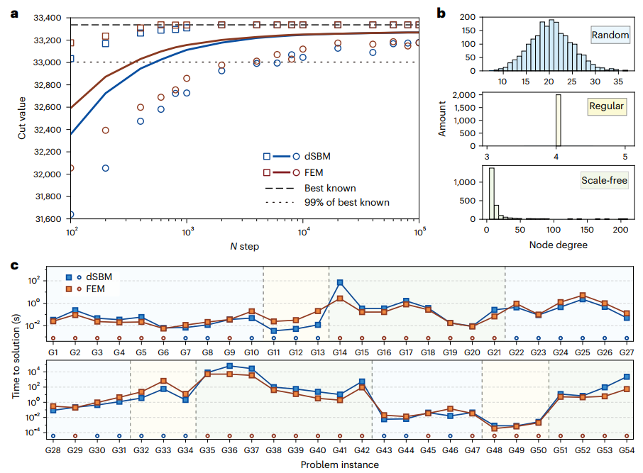 在最大割问题(MaxCut)测试中,FEM在2000节点全连接图K_{2000}上仅用1000次退火步骤即达到已知最优解(33,337),并在G-set基准测试的54个实例中,有33个实例的求解速度超越当前最优算法dSBM:
