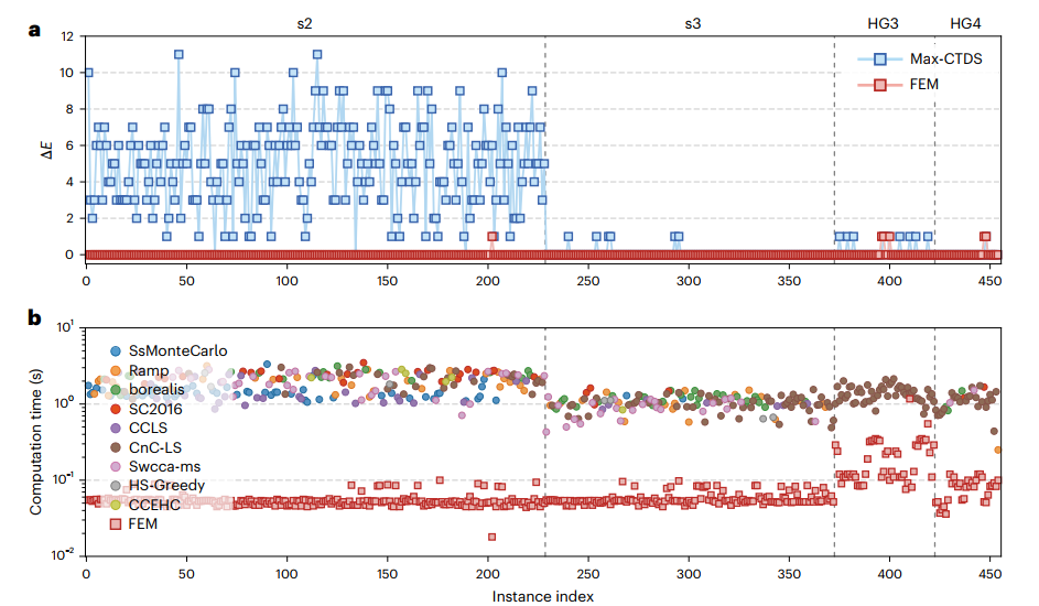 对于高阶交互的最大可满足性问题(Max k-SAT),FEM在MaxSAT 2016竞赛的454个实例中,对标了SsMonteCarlo, Ramp, borealis, SC2016, CCLS, CnC-LS, Swcca-ms, HS-Greedy和CCEHC等多个求解器,其中FEM在448个问题上找到最优解,其余6个仅差1个子句,全面领先Max-CTDS算法(图6a),且GPU加速显著提升求解效率(图6b)。