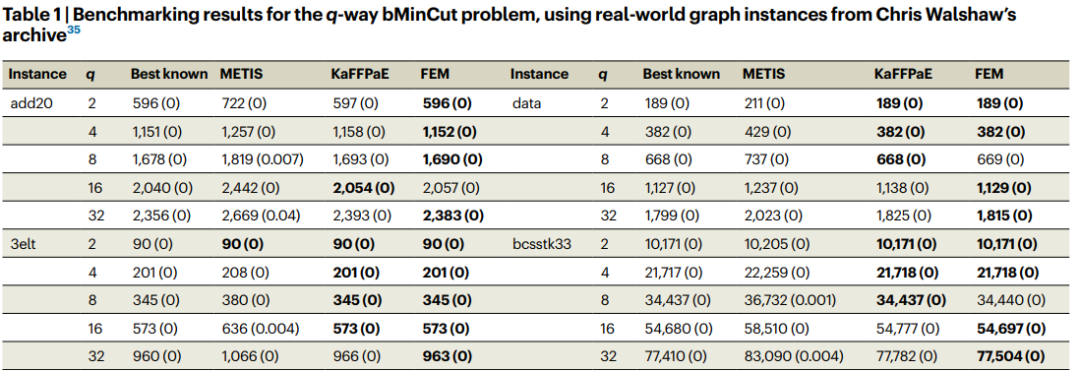 针对平衡最小割问题(bMinCut),FEM在Chris Walshaw存档的真实世界图(如add20、3elt)上全面优于METIS,尤其在32分组时显著超越竞赛优胜算法KaFFPaE: