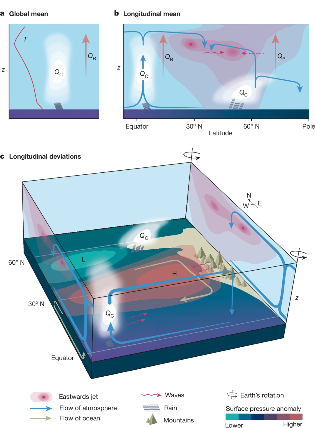 3. 经向偏差维度:地形强迫和局地加热解释了副热带高压系统、季风等区域性现象。
