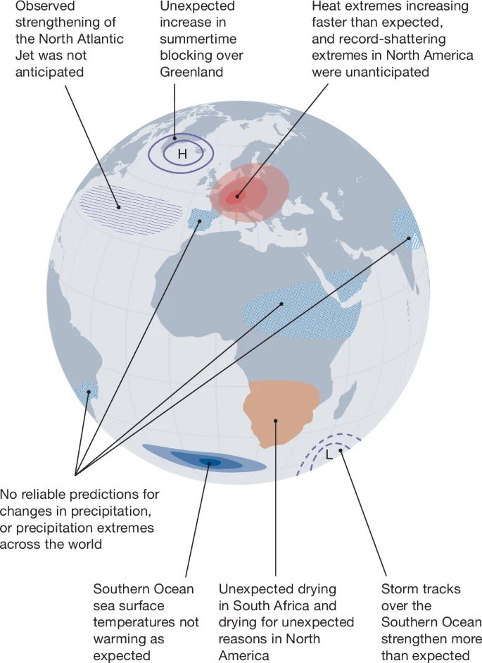 图 2. 不断累积的区域差异。温度(红色和蓝色实色)、大气环流(紫色)、降雨(蓝色孵化)和湿度(橙色)真实世界与大西洋地区综合气候模型预测之间的差异(类似的差异可以在全球范围内发现)。