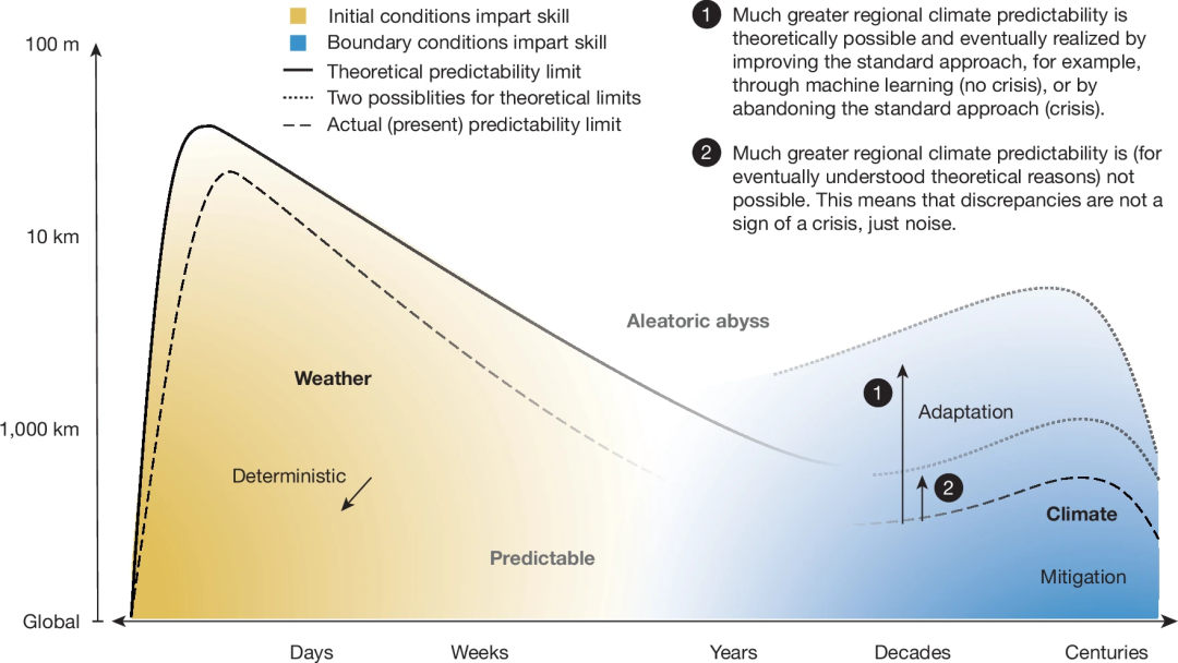 图 3. 地球系统的可预测性。理论(实线)与实际(虚线)可预测性限制的示意图。高于可预测极限的尺度在理论上(实线)或在实践中(虚线)是不可预测的。不同可预测性来源的影响用颜色表示,初始条件(黄色)主要决定天气的可预测性(具有确定性成分),边界条件(蓝色)决定气候预测。虽然最近的工作表明在这个问题上取得了一些进展,但在中间尺度上的可预测性是模糊的。两条虚线对比了两种可能性,以及每种可能性与可能发生的危机之间的关系,这反映了人们对是什么决定了气候的理论可预测性极限缺乏了解。