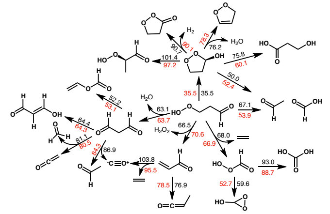 图四| KHP的反应网络 其中红色/黑色的数字分别为DFT计算/React-OT生成的过渡态上计算得到的活化能