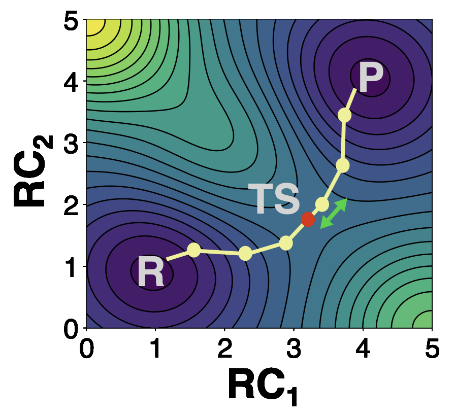 图一|二维势能面上的反应物(R),过渡态(TS),产物(P),以及最小能量路径(minimal energy pathway)