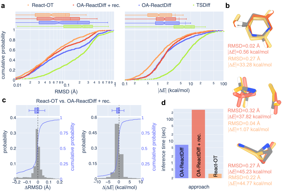 图三 | React-OT和OA-ReactDiff模型在生成过渡态的精度和速度方面的性能对比 a. React-OT得到满足特定RMSD要求的TS结构的可能性高于两种扩散模型。b. OA-ReactDiff和React-OT生成过渡态的质量。c. 两种模型预测效果的对比。d. 运行速度的比较。