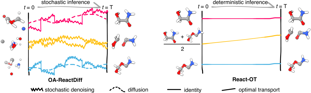 图二 | 扩散模型和最佳传输模型生成TS结构的工作概述(左)OA-ReactDiff的随机推理过程。(右)React-OT的确定性推理过程