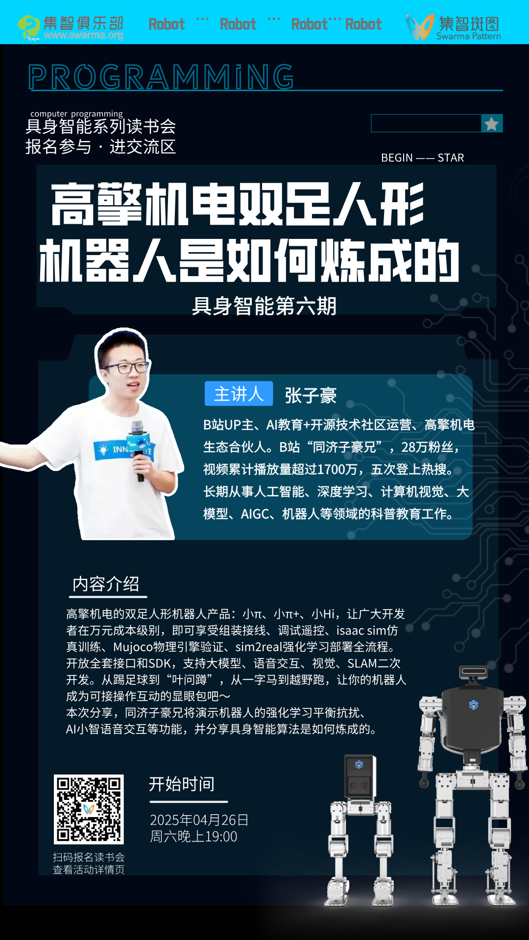 同济子豪兄将演示机器人的强化学习平衡抗扰、AI小智语音交互等功能,并分享具身智能算法是如何炼成的。