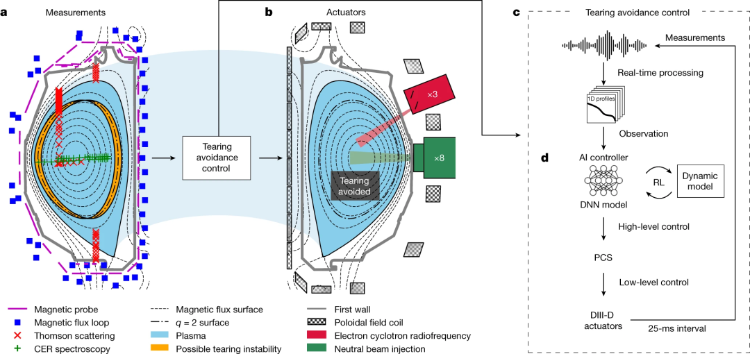 通过深度强化学习控制聚变等离子体以避免撕裂不稳定性的模型框架 | 来源:Seo, J., Kim, S., Jalalvand, A. et al. Avoiding fusion plasma tearing instability with deep reinforcement learning. Nature 626, 746–751 (2024)