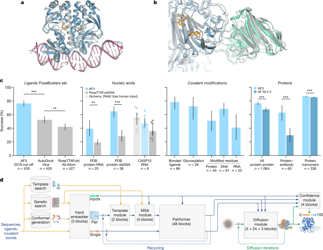 用AlphaFold3预测的精准蛋白质结构 | 来源:Abramson, J., Adler, J., Dunger, J. et al. Accurate structure prediction of biomolecular interactions with AlphaFold 3. Nature 630, 493–500 (2024).