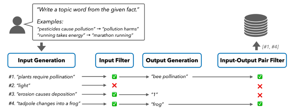 在这一领域的最新突破中,卡内基梅隆大学和清华大学研究团队开发的SELF-GUIDE方法[6]展示了显著成果。这种创新方法通过设计高效的多阶段生成机制,使语言模型能够自主生成任务特定的训练数据。系统通过逐步生成“输入-输出”数据对,并经过严格的筛选过程,确保生成数据的质量和相关性。这些自生成的数据随后被用于模型的进一步微调,形成一个良性的自我提升循环。