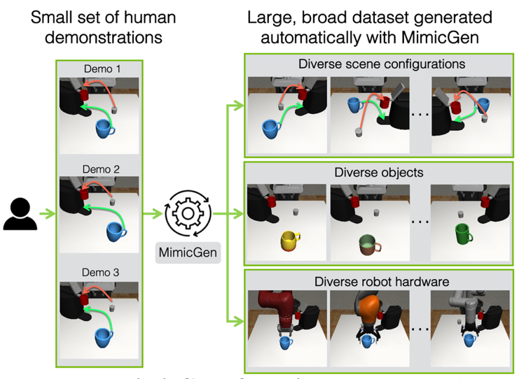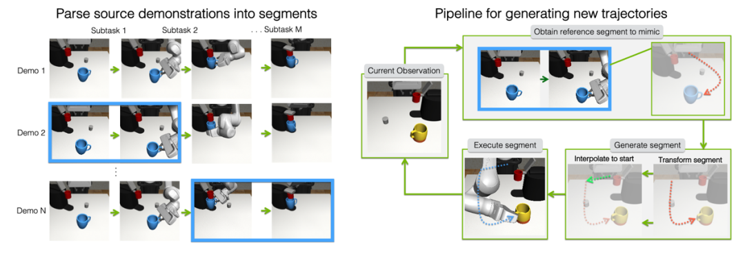 MimicGen合成数据生成示意图|图片来源:Mandlekar et al.(2023) “Mimicgen: A data generation system for scalable robot learning using human demonstrations.”